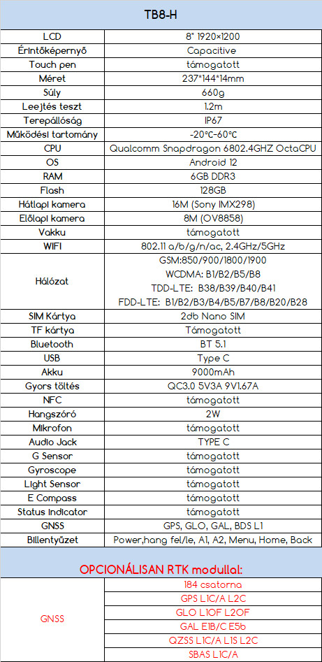 FORGEO TB8H Android tablet FORGEO TB8H Android tablet tablet TB8H tablet Rövid ismertető előző következő telefon: +36 70 337 1015 email: uh.oegrof@ofni iroda: 6500 Baja, Árpád tér 1 székhely: 6500 Baja, Bokodi út 54 FORGEO TB8H ANDROID TABLET MéRTéK szoftverrel ÁR: 499.000 ft + ÁFA OPCIONÁLISAN RTK modullal: FORGEO TB8H ANDROID RTK TABLET MéRTéK szoftverrel ÁR:799.000 ft + ÁFA